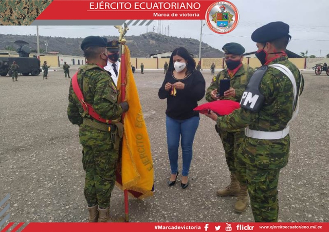 La señora Datzania Villao Burgos, gobernadora de Santa Elena, en ceremonia militar hizo la entrega y colocación de una mención de honor al Estandarte nacional del Grupo de...
