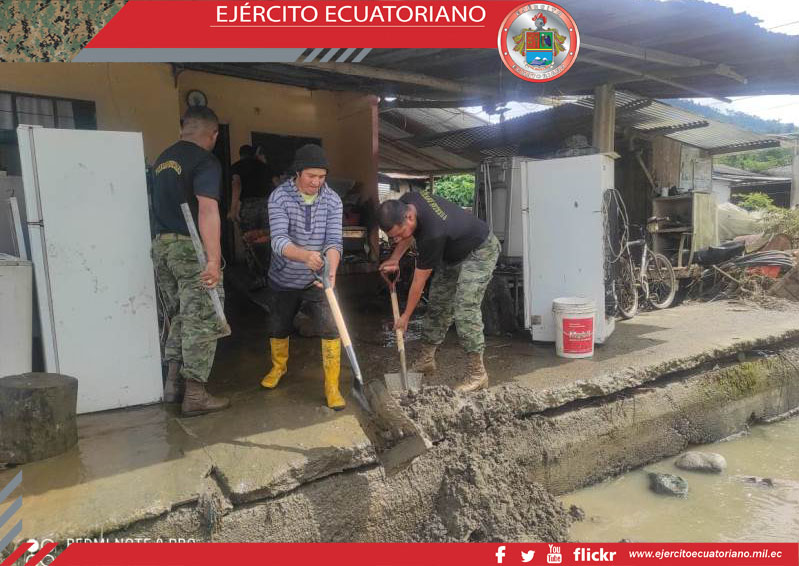 Nuevamente las lluvias provocaron el desbordamiento del río Quindigua y la inundación de este poblado de la provincia de Cotopaxi. Personal del Grupo de Fuerzas Especiales N.° 26...