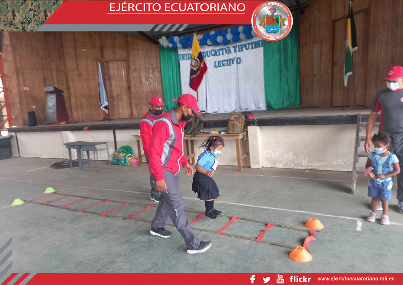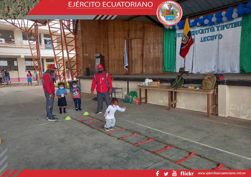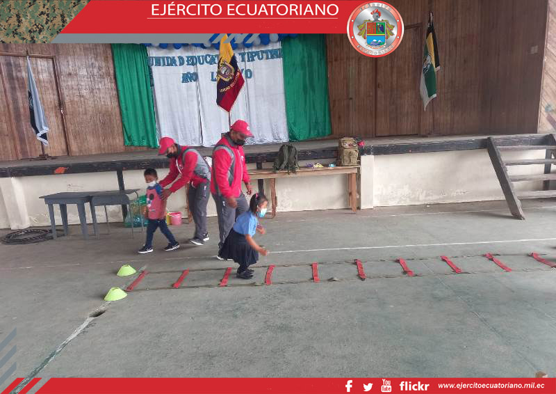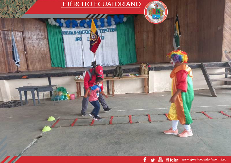 En la provincia de Orellana, el personal militar del Batallón de Selva N.º 57 Montecristi participa en la campaña Puntos de Reencuentro mediante actividades lúdicas dirigidas a...