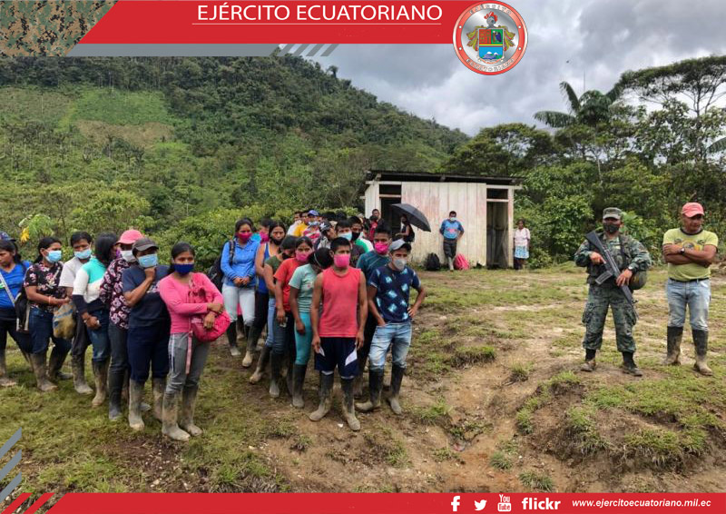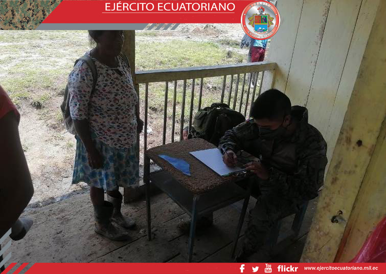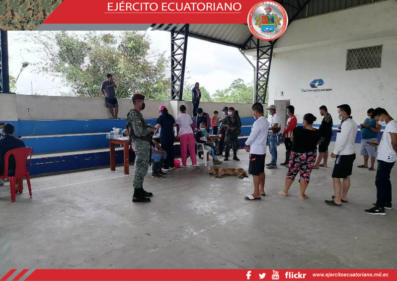 En Sucumbíos, personal de la Brigada de Selva N.° 19 Napo ,a través del Grupo de Fuerzas Especiales N.º 53 Rayo, en coordinación con el Ministerio de Salud Pública, proporciona...