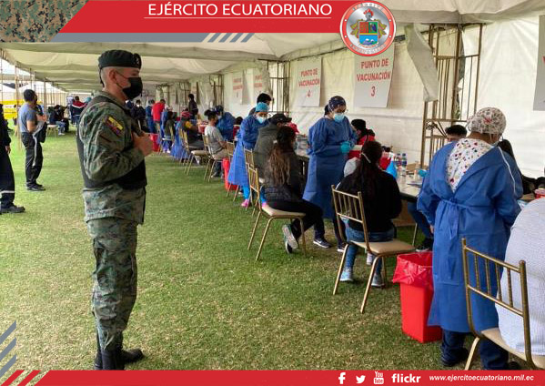 El Grupo de Artillería Lanzadores Múltiples N.° 80 Calderón, en apoyo al Ministerio de Salud de la Zona 6, brinda seguridad durante el proceso de inoculación de 10 296 vacunas de...