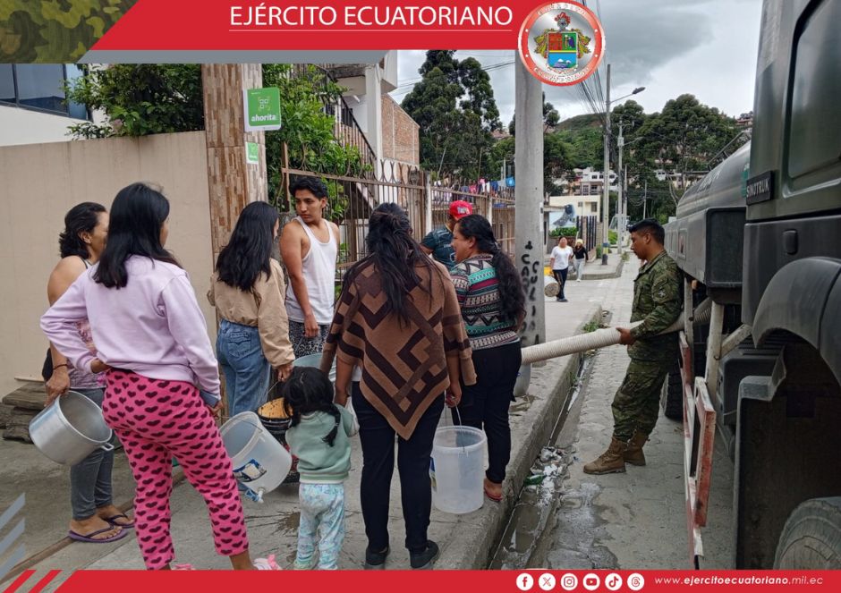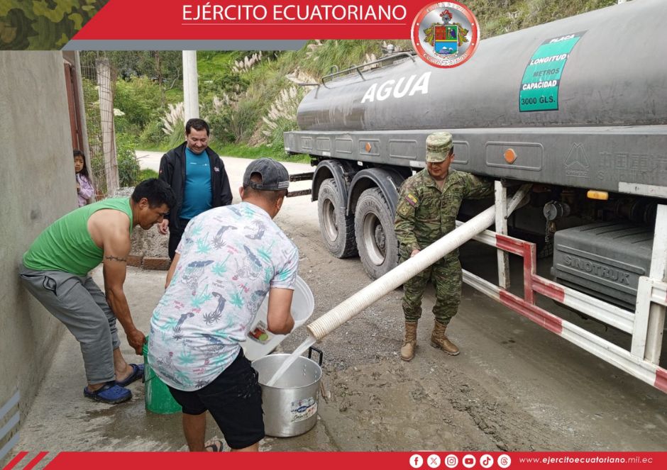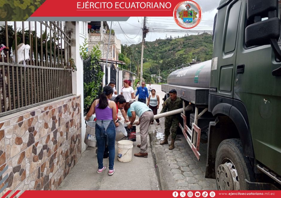 Personal militar en una actividad coordinada con el municipio de Loja, realizó la entrega de agua a los barrios afectados por los daños en las tuberías de distribución en las...