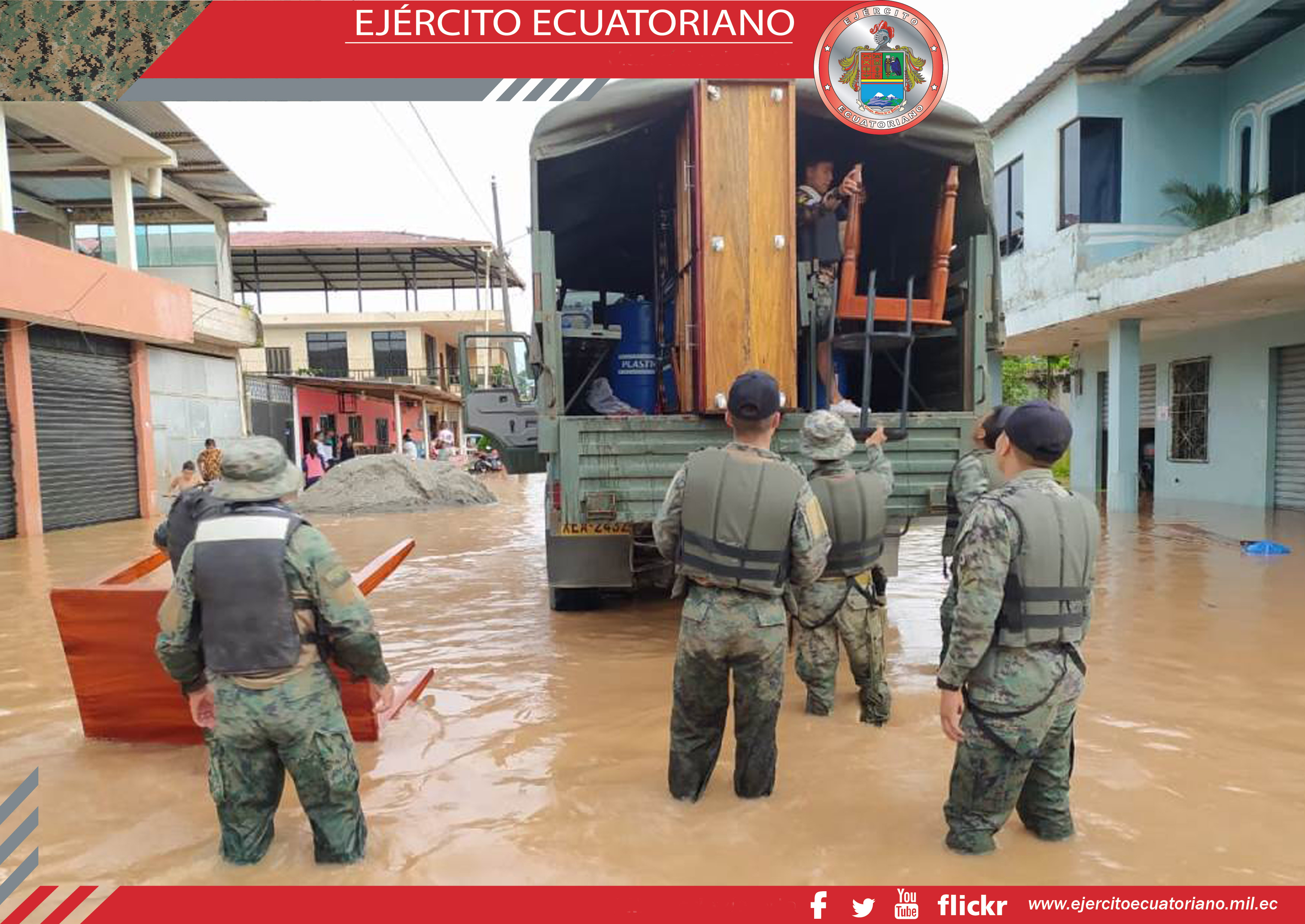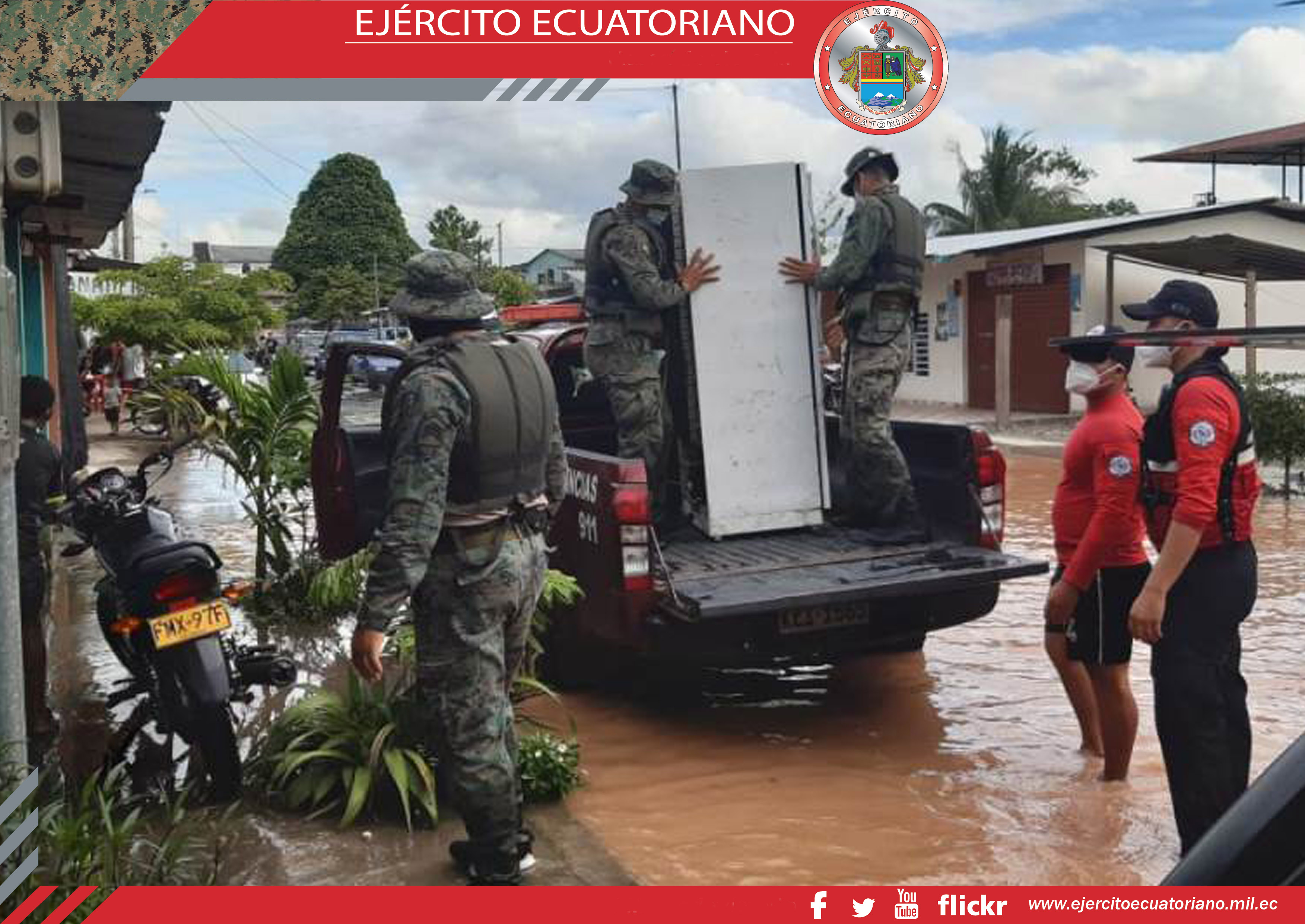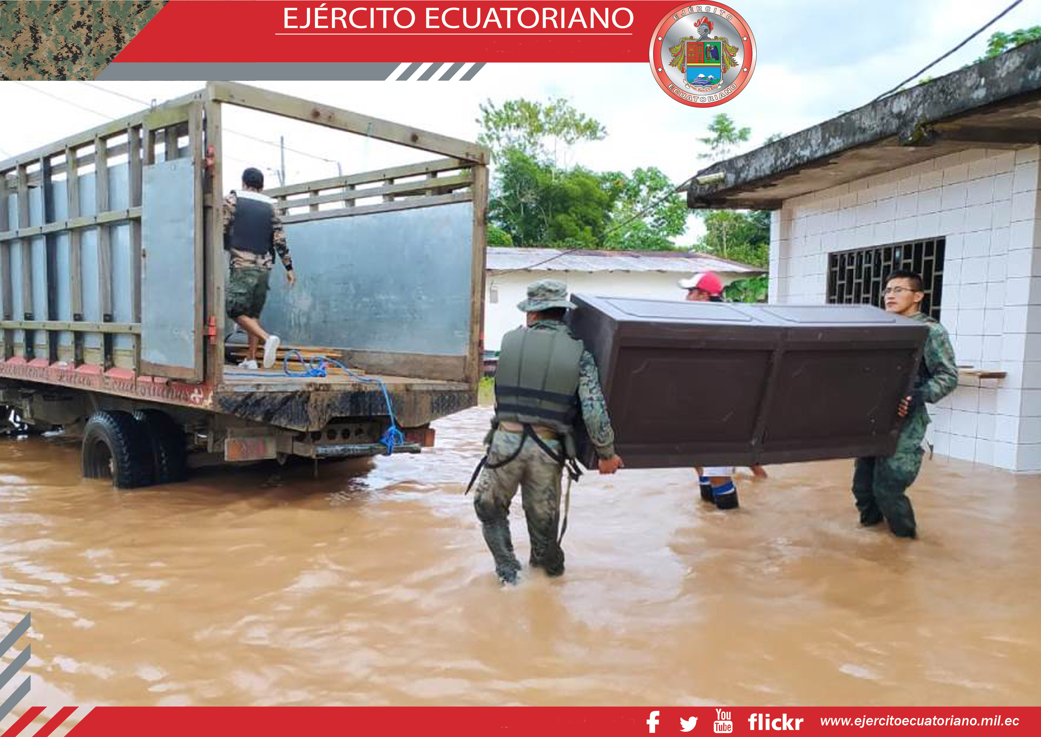 En apoyo al Servicio Nacional de Gestión de Riesgos y Emergencias, personal del Batallón de Selva N.° 56 Tungurahua, ante la emergencia presentada por las inundaciones en la...