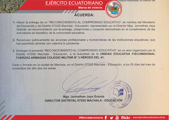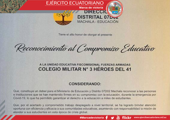 El Ejército Ecuatoriano, a través de la Unidad Educativa de Fuerzas Armadas Colegio Militar N.° 3 Héroes del 41, recibió el Reconocimiento al Compromiso Educativo por parte del...