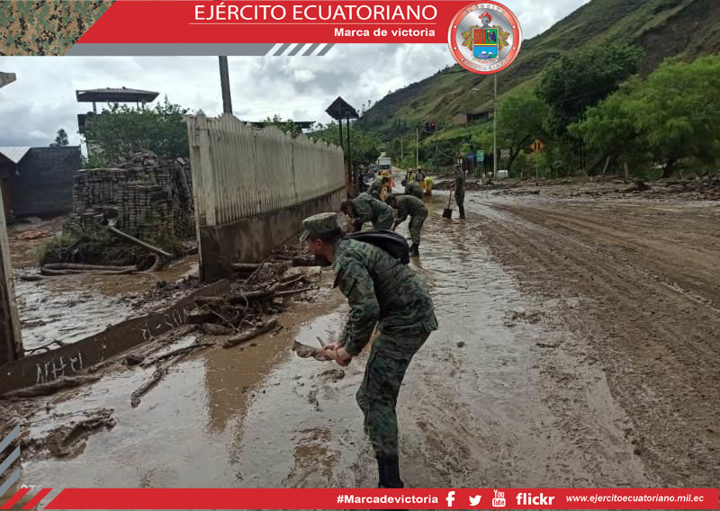 Ante el deslave producido por las fuertes precipitaciones en el sector El Durazno, ubicado entre el tramo de la vía Santiago-San Lucas, personal militar del Grupo de Caballería...