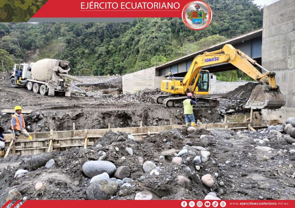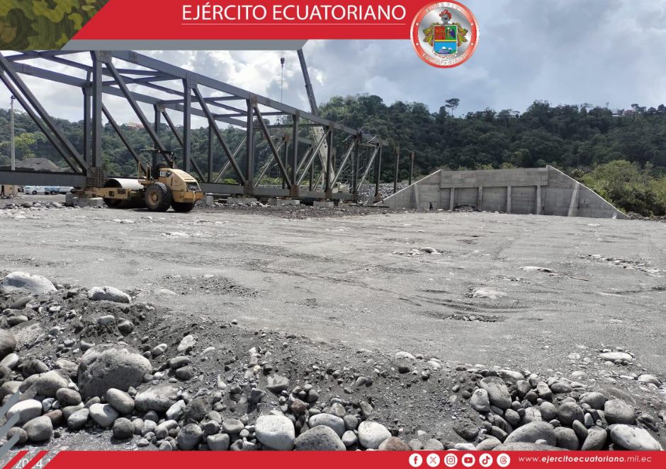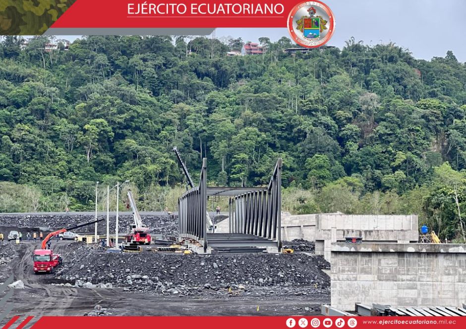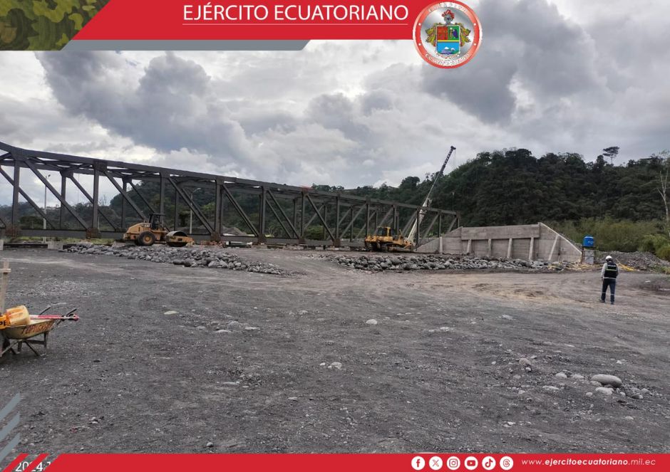 El Ejército Ecuatoriano a través del Cuerpo de Ingenieros del Ejército (CEE) realiza el armado de la estructura metálica del puente principal sobre el río Upano, como parte de...