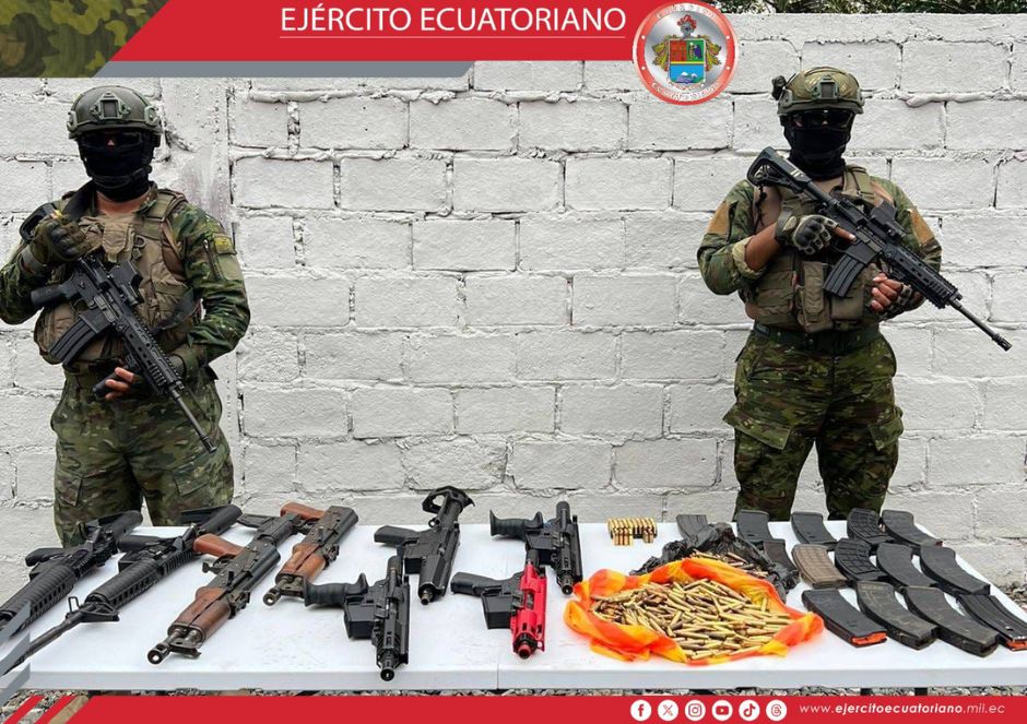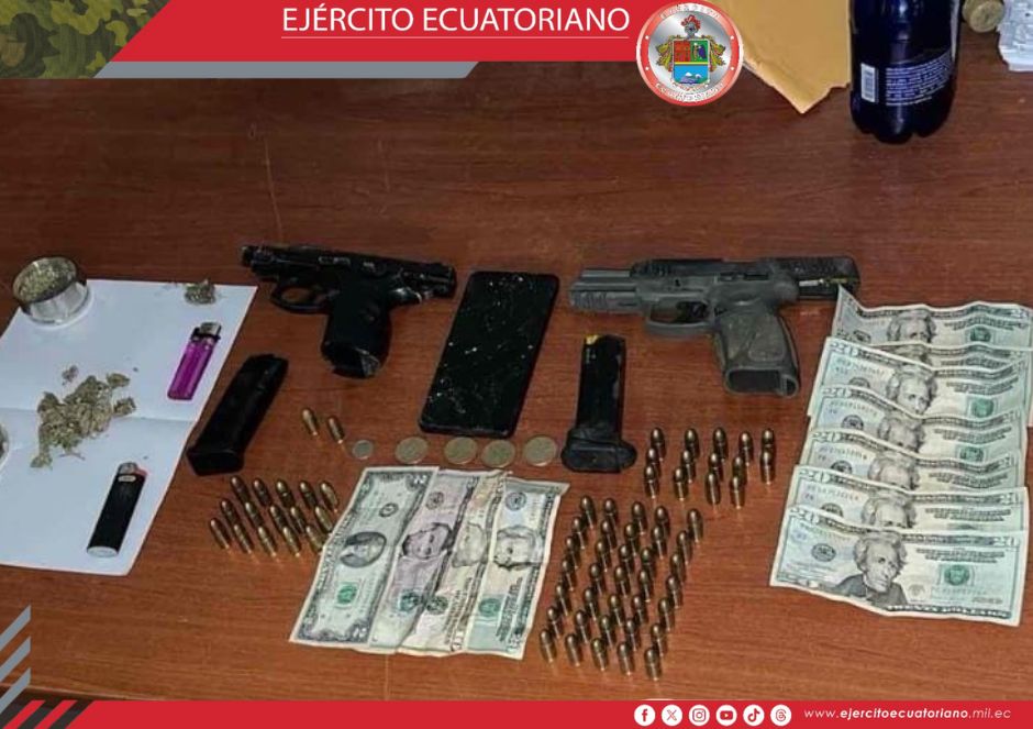 Soldados del Ejército Ecuatoriano mientras realizaban operaciones de control en el cantón El Triunfo, aprehendieron a dos individuos que portaban armas y municiones sin los...