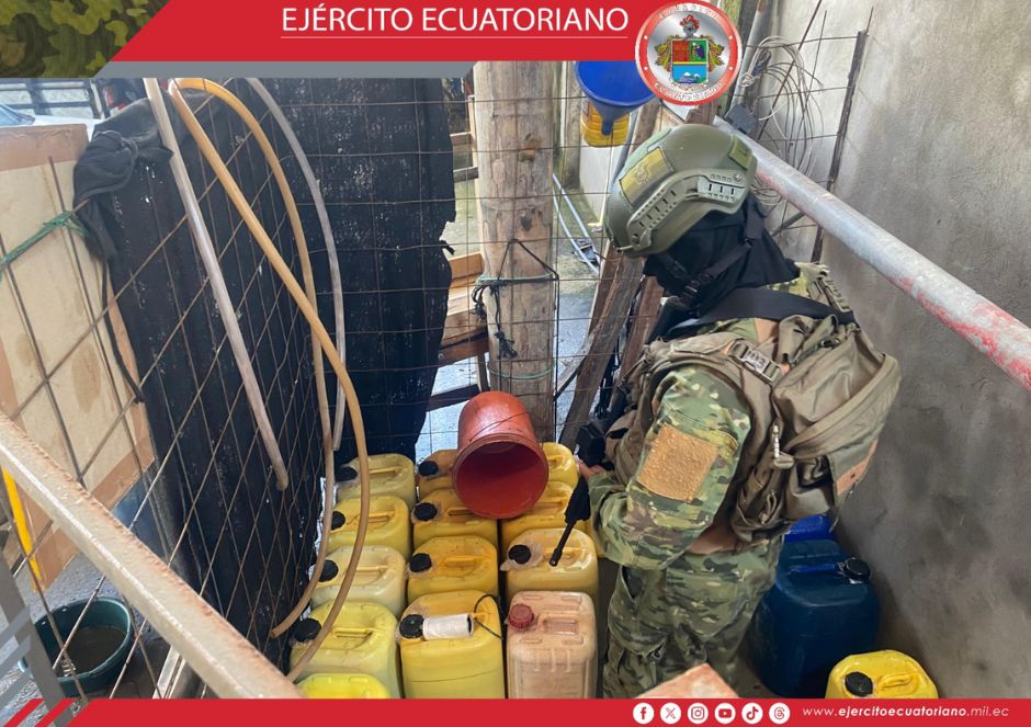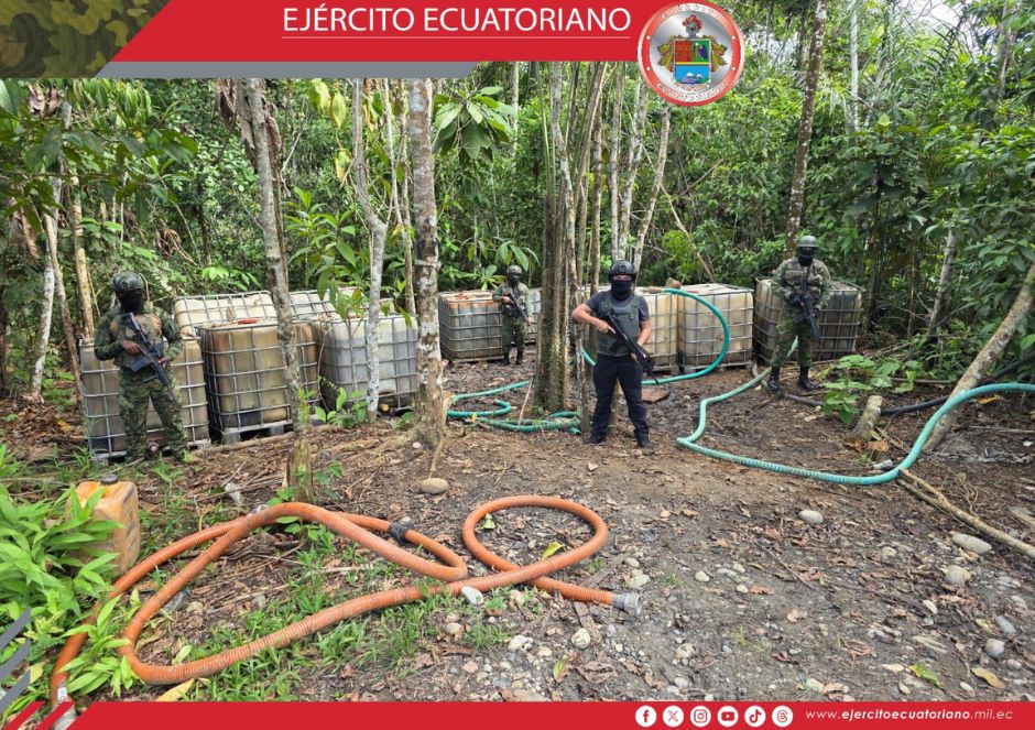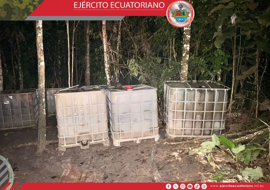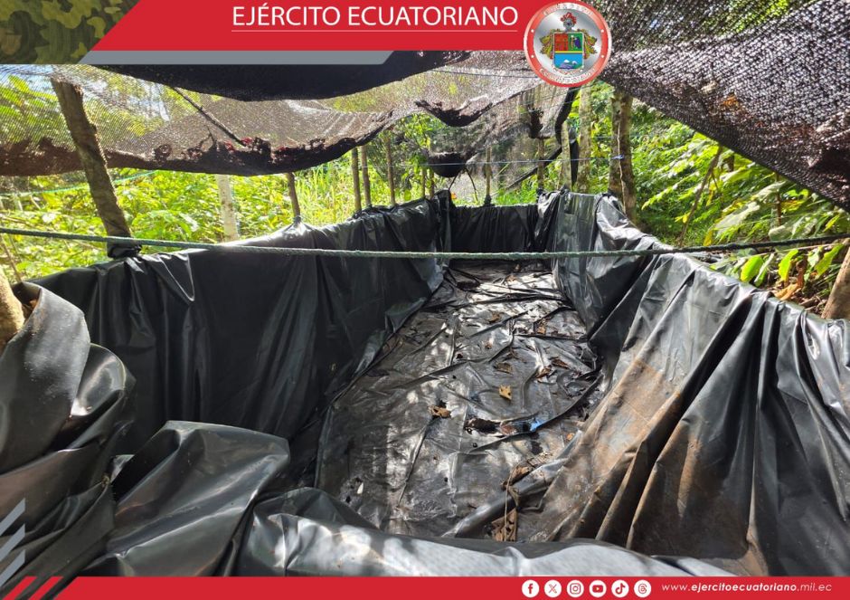 Personal del Ejército Ecuatoriano descubrió una piscina clandestina de almacenamiento de combustible y 20 tanques con aproximadamente 2500 galones de hidrocarburo en el sector...
